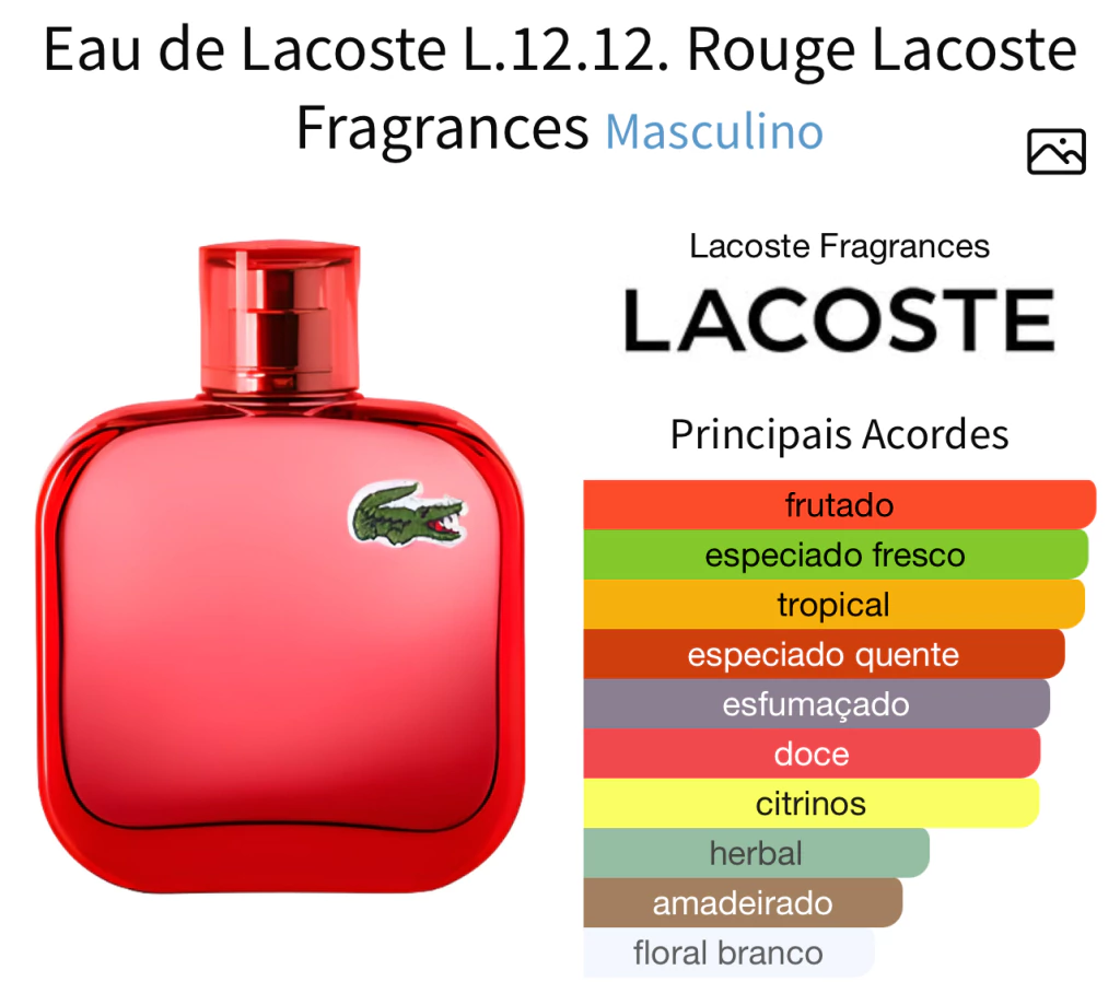 Perfume masculino especiado amadeirado. Picante e passional, Eau de Lacoste L.12. 12 Rouge Energetic Lacoste é perfeito para impressionar à primeira vista.