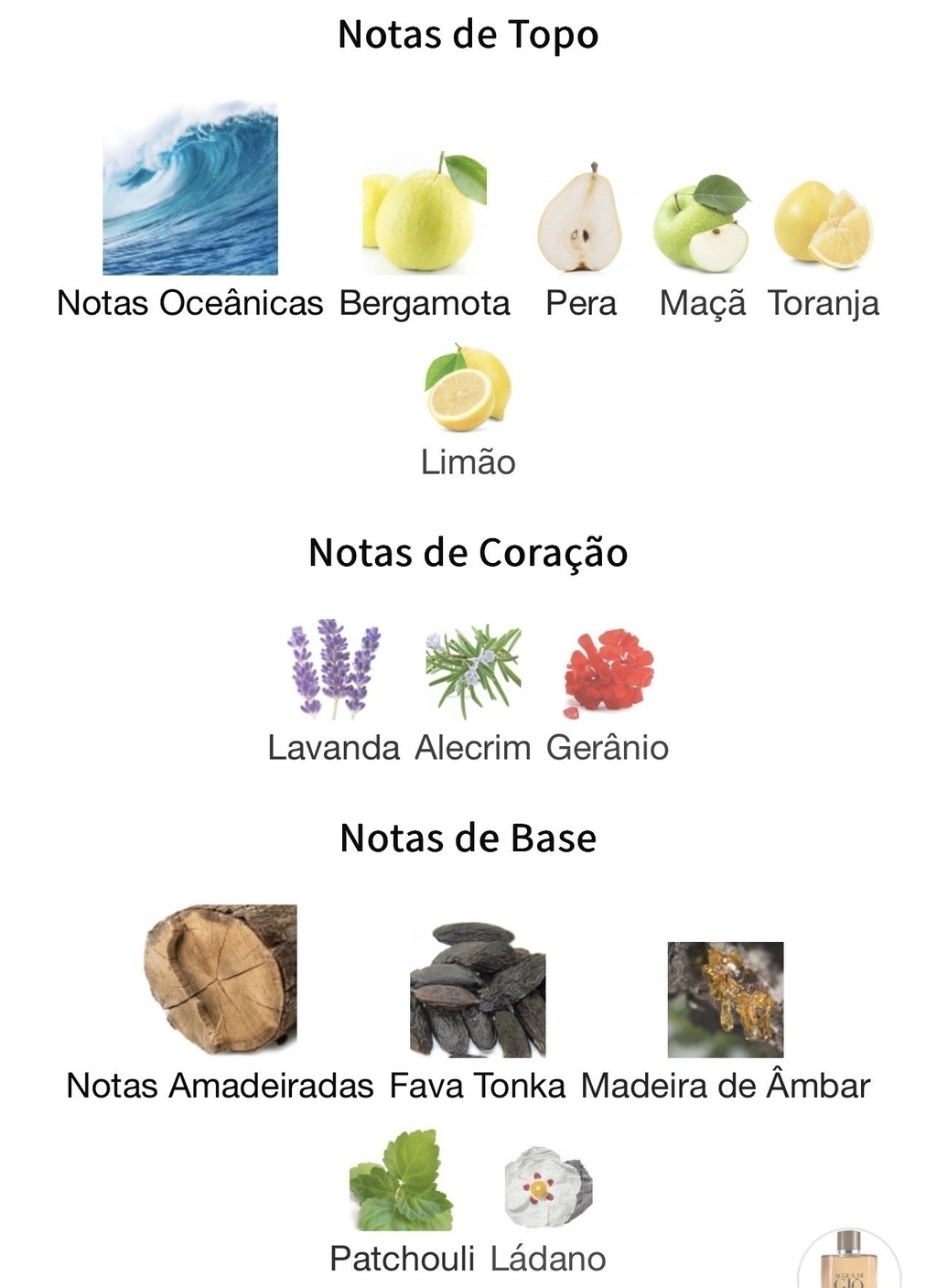 As notas de topo são: Notas Oceânicas, Bergamota, Pera, Maçã, Toranja e Limão.