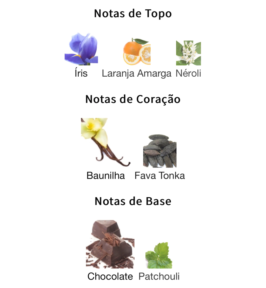 As notas de topo são: Íris, Laranja Amarga e Néroli.