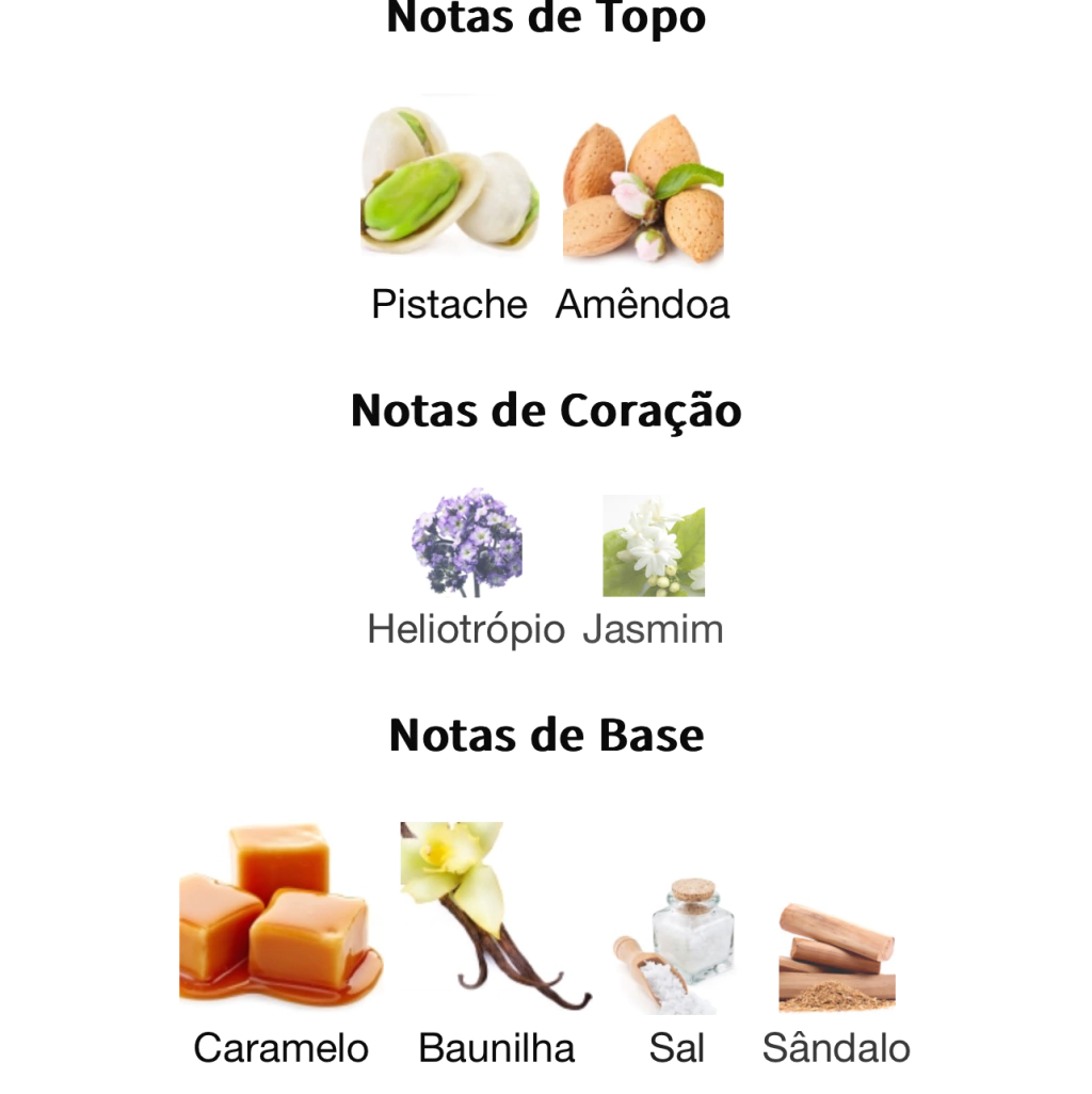 Notas de fundo: baunilha, caramelo salgado, sândalo
