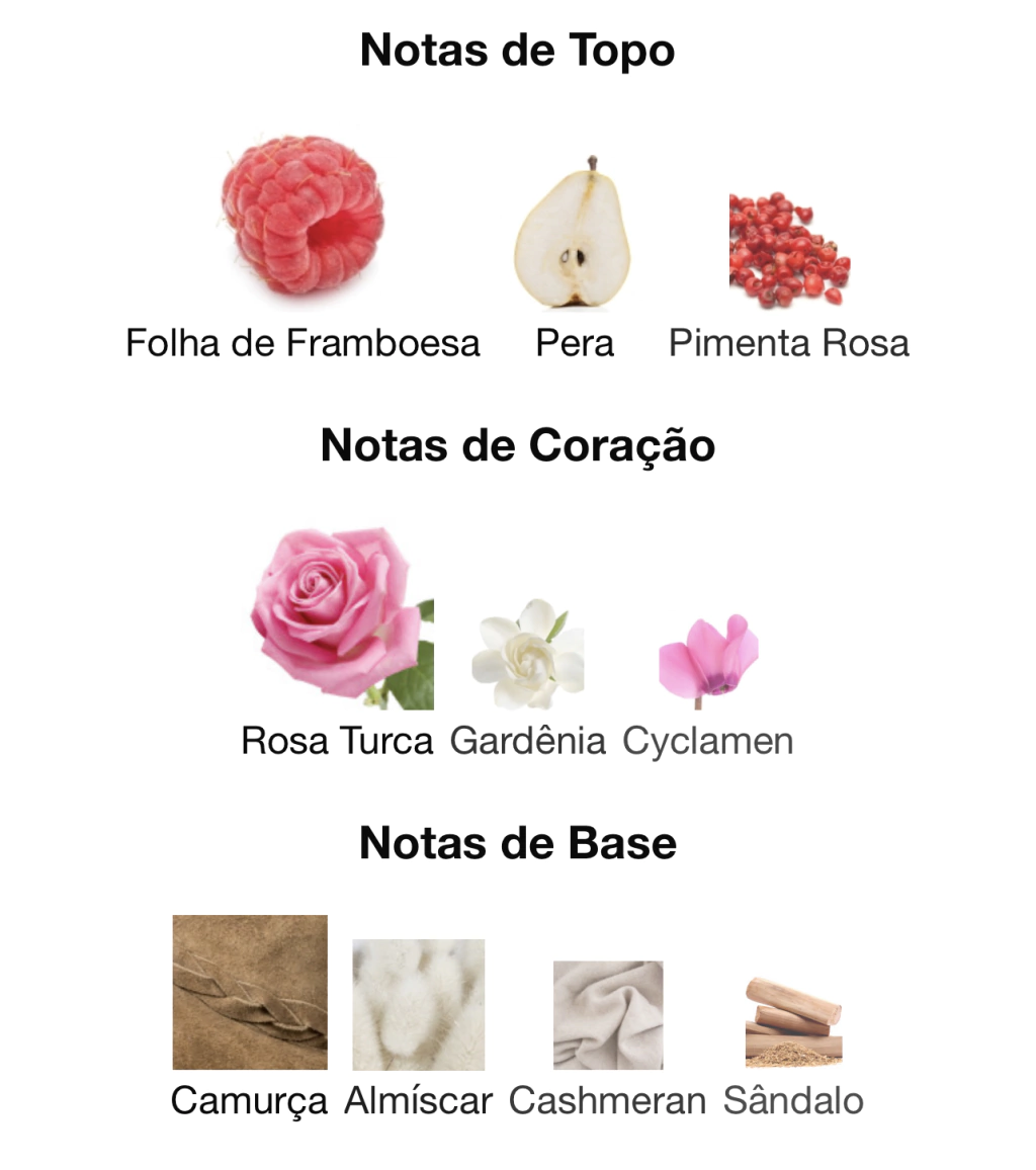 Topo: Folhas de Framboesa. Corpo: Rosa Turca. Fundo: Almíscares de Camurça.