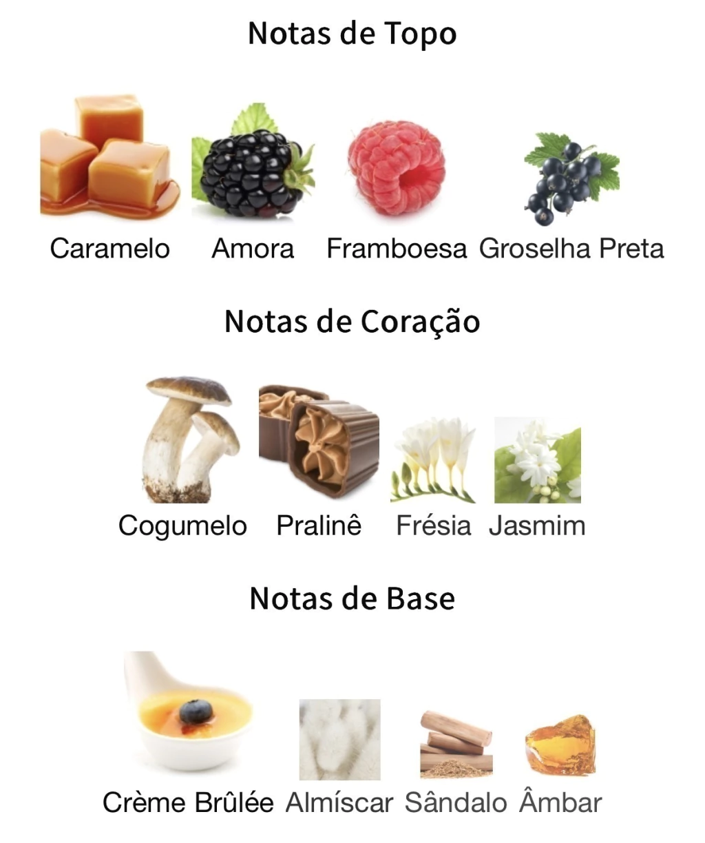 As notas de fundo são: Crème Brûlée, Almíscar, Sândalo e Âmbar.