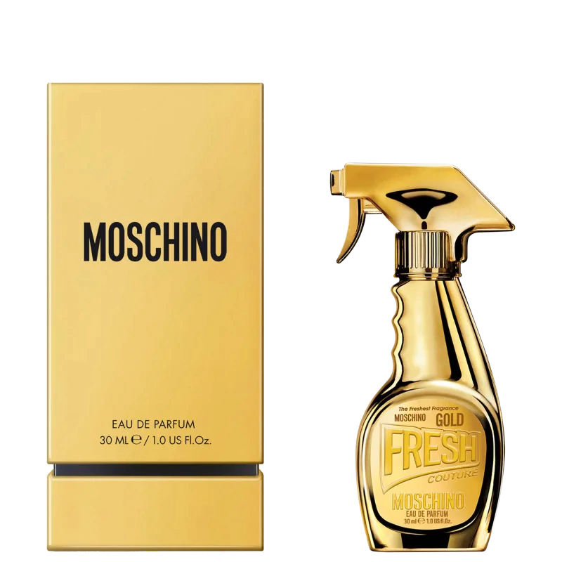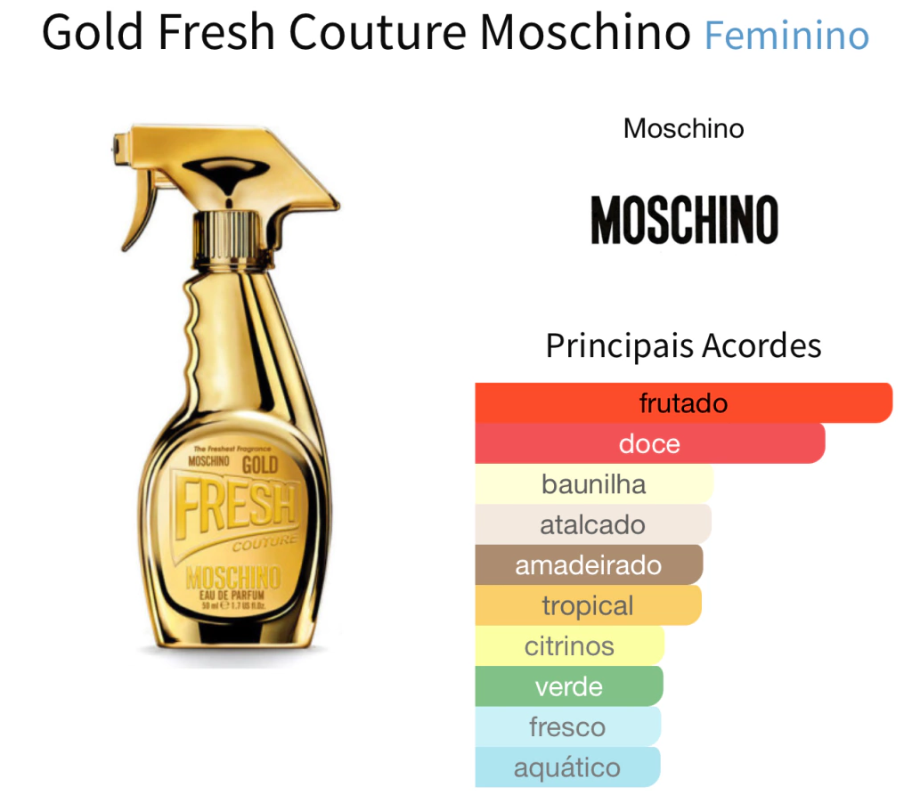 A fragrância Gold Fresh de Moschino apresenta em suas notas de topo pêra, manga, pêssego branco, folhas de ruibarbo, mandarina e toranja, que se misturam com as notas de corpo com orquídea, jasmim e lírio-do-vale e finalizam com incrível baunilha, almíscar, akigalawood, sândalo e patchouli.