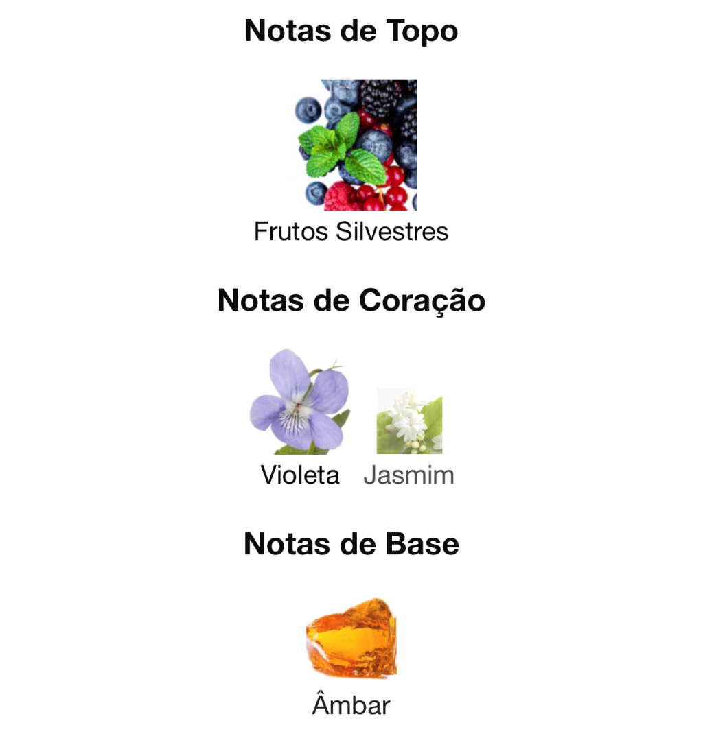 Gourmand e frutado, realçado pelos aromas femininos de frutas vermelhas e notas florais de violeta e jasmim. Graças às suas notas de base de madeira e âmbar cremoso.