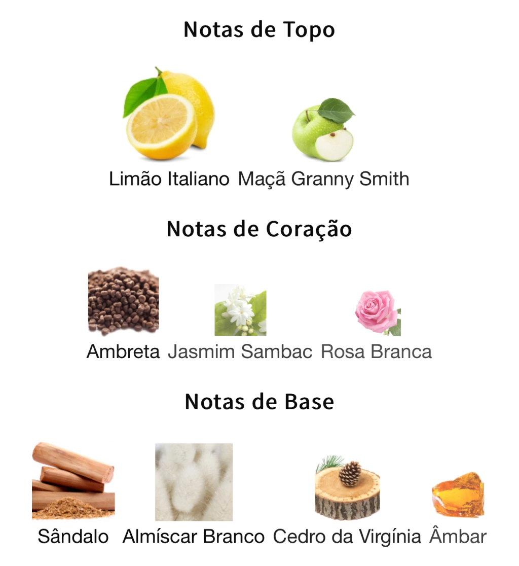 Topo: Limão Italiano e Maçã Granny Smith. Corpo: Abelmosco, Jasmim Sambac e Rosa Branca. Fundo: Cedro, Almíscar, Sândalo Amyris, Vetiver e Ambrox.