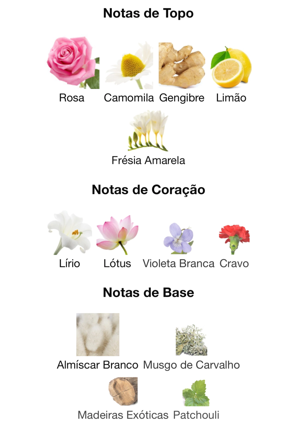 Topo: Rosa, Lichia e Frésia Amarela. Corpo: Flor de Lótus e Violeta Branca. Fundo: Musgo de Carvalho, Patchouli e Almíscar.