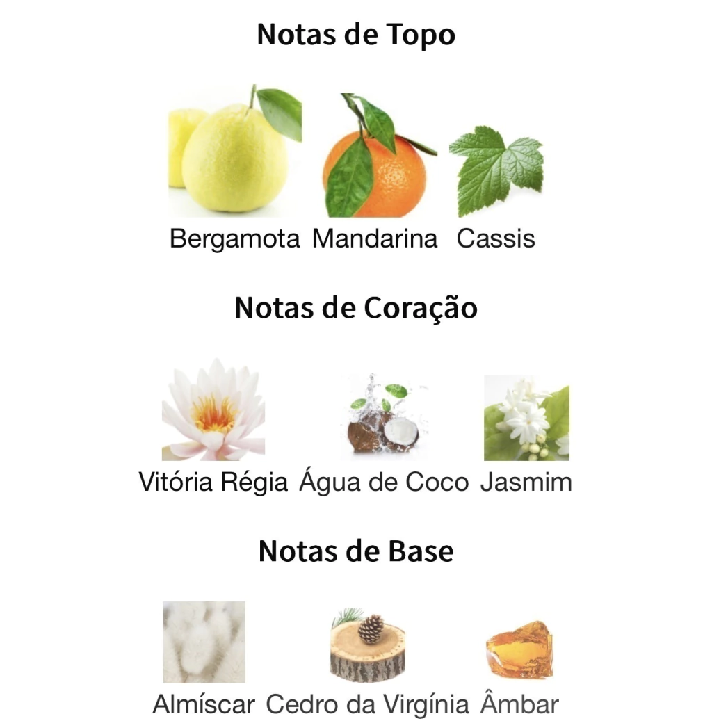 As notas de coração são: Vitória Régia, Água de Coco e Jasmim.