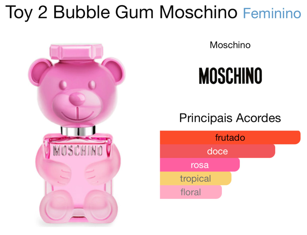 Toy Bubble Gum é um perfume Moschino feminino floral frutal. Uma fragrância cheia de personalidade, com diversos acordes vibrantes e alegres.
