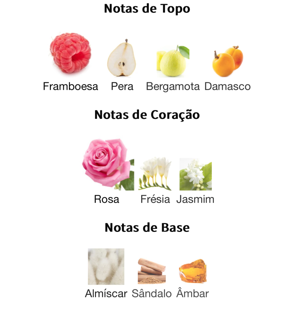 Topo: Bergamota, Framboesa, Damasco e Pera. Corpo: Frésia, Rosa e Jasmim. Fundo: Musk, Âmbar e Sândalo.