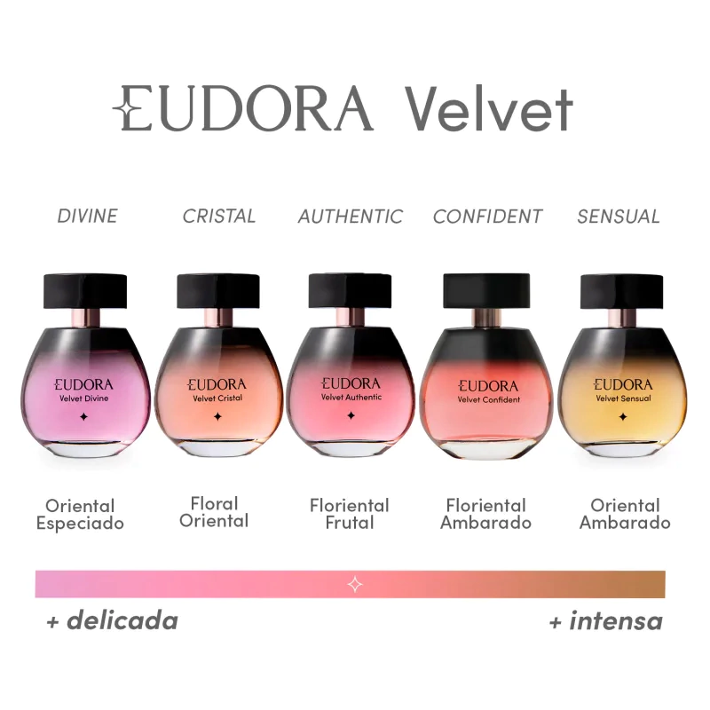 Com fragrância ainda mais marcante e intensa, Velvet Sensual Eudora traz o brilho da Bergamota e a feminilidade do Muguet, envoltas pelo toque quente e marcante do Âmbar, em uma fragrância que envolve.