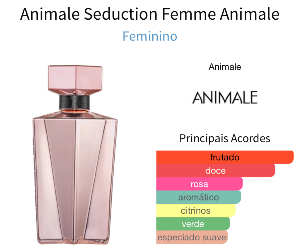 O Perfume Animale Seduction Femme abre com a suculência do cassis aliado a toranja e framboesa. No seu coração, a rosa, o jasmim e a tuberosa instigam a delicadeza feminina. Um fundo elegante e sensual se sobressai com os acordes de patchouli, âmbar e pralinê. Fragrância irresistível, envolvente e sofisticada ao mesmo tempo.