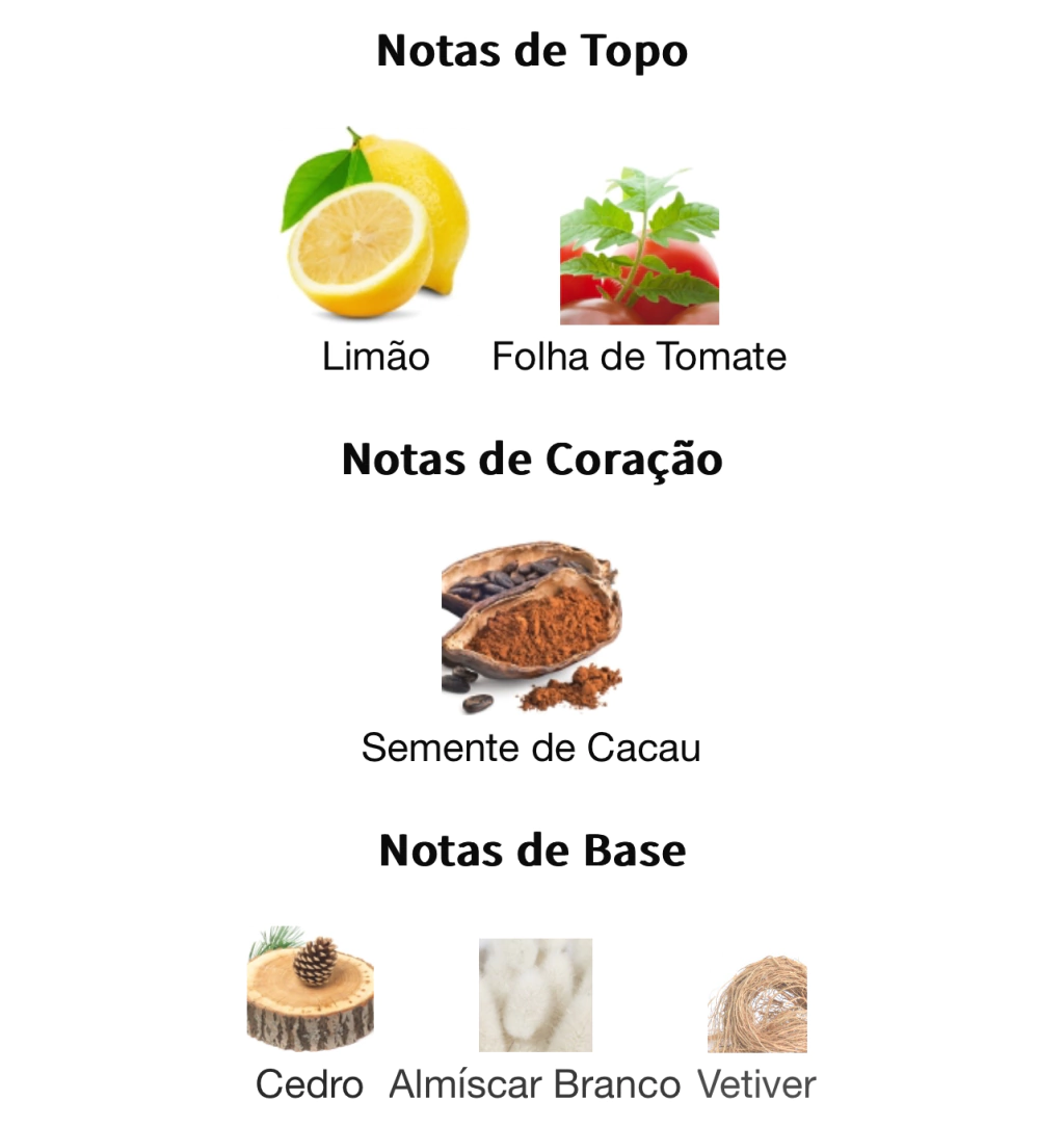 Topo: Lima e folhas de pomelo. Corpo: cacau. Fundo: almíscar, polissandro e vetiver.