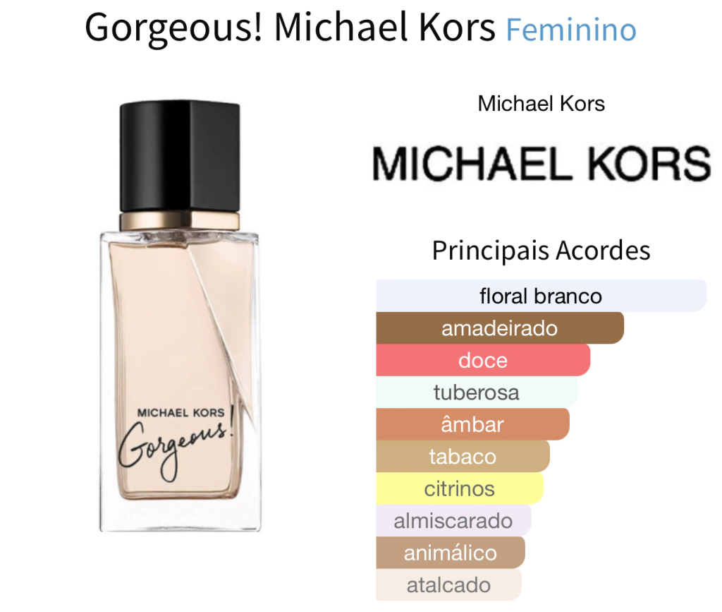 Gorgeous! é um perfume Michael Kors feminino floral amadeirado almiscarado. Uma celebração das mulheres de espírito confiante.