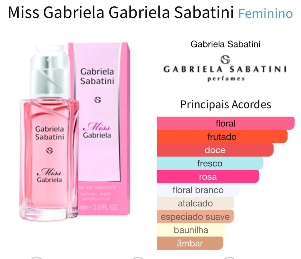 Miss Gabriela de Gabriela Sabatini possui os melhores ingredientes para uma fragrância vibrante, alegre e espirituosa, que causa uma impressão genuína e singular.