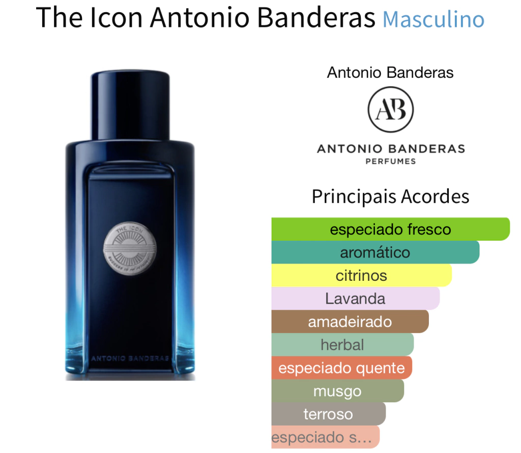 The Icon é um perfume Banderas masculino oriental amadeirado. Uma fragrância cheia de atitude, que abre territórios para o homem de sucesso mostrar a singularidade de um verdadeiro ícone.
