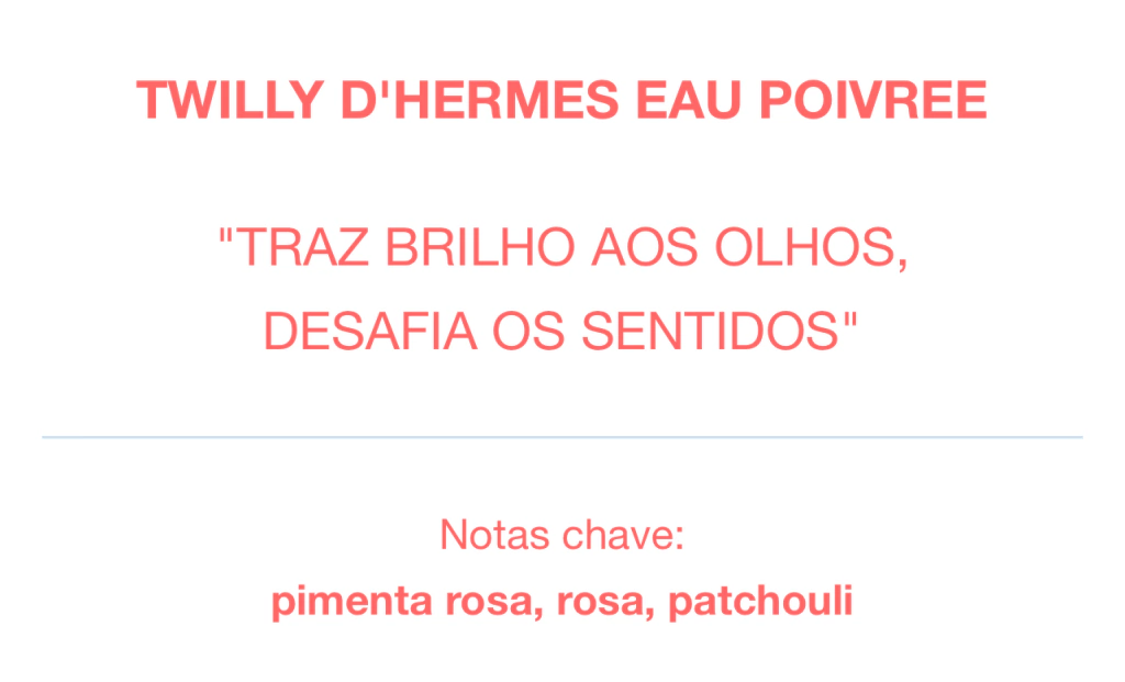 O Perfume Feminino Twilly d’Hermès Eau Poivrée, de Hermès, traz um aroma condimentado arborizado floral de personalidade incisiva e envolvente, com notas coloridas de rosa fresca, patchouli e pimenta rosa.