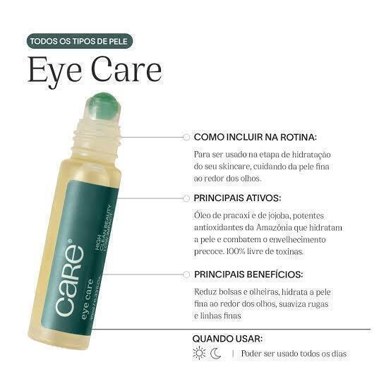 O Sérum para Área dos Olhos CARE Natural Beauty Eye Care vem com um aplicador de Pedra de Jade que drena e massageia a área ao redor dos olhos. Sua fórmula é enriquecida com óleos de pracaxi e jojoba, poderosos antioxidantes da Amazônia, que hidratam a delicada pele ao redor dos olhos e combatem o envelhecimento precoce.